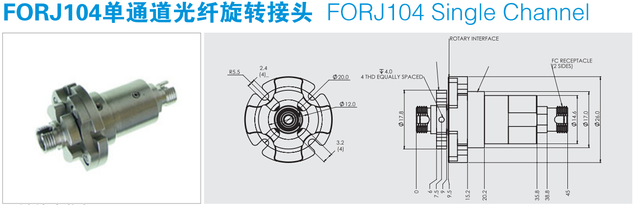 FORJ104單通道光纖滑環(huán)用于單?;蚨嗄O到y(tǒng)的光電旋轉(zhuǎn)連接;完全的雙向旋轉(zhuǎn);與現(xiàn)有的電氣滑環(huán)設(shè)計(jì)相融合;全封閉結(jié)構(gòu);能為客戶量身定制所需要的光纖滑環(huán)